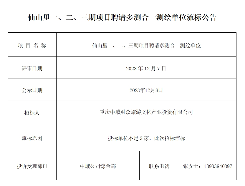 仙山里一、二、三期项目聘请多测合一测绘单位流标公告