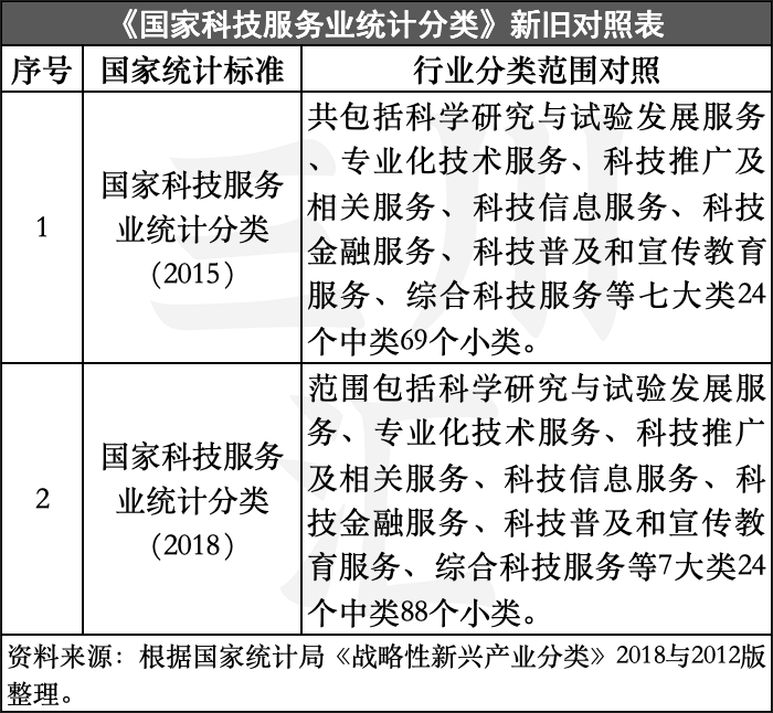 为适应行业发展和统计工作的需要,2017年6月,新的《国民经济行业分类》(GB/T 4754-2017)正式发布,鉴于《国家科技服务业统计分类(2015)》已无法满足当前行业发展和统计需求,国家统计局于2018年12月根据新的国民经济行业分类标准进行修订,完成了2018版《国家科技服务业统计分类》,在保持2015版分类原则、方法和框架不变的前提下做出了相应调整。